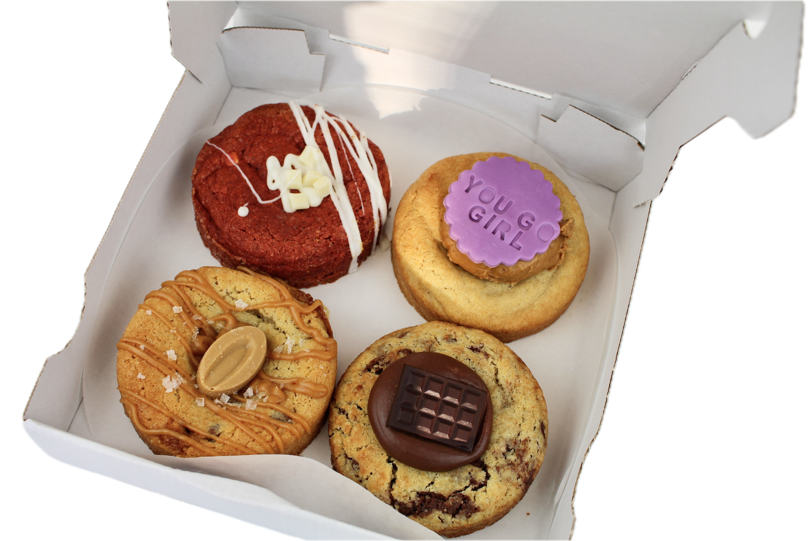 In dieser liebevoll zusammengestellten Cookie-Box erwarten dich vier handgemachte Premium-Cookies, jeder mit seinem ganz eigenen Charakter: